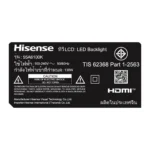 – รับประกัน 3 ปี โดย บริษัท ไฮเซ่นส์ อินเตอร์เนชั่นแนล (ประเทศไทย) จำกัด ที่อยู่ 202 อาคารเลอ คองคอร์ด ทาวเวอร์ ชั้นที่ 14 ห้อง (สำนักงานใหญ่) ถนนรัชดาภิเษก แขวงห้วยขวาง เขตห้วยขวาง กรุงเทพฯ โทร 02-017-0077