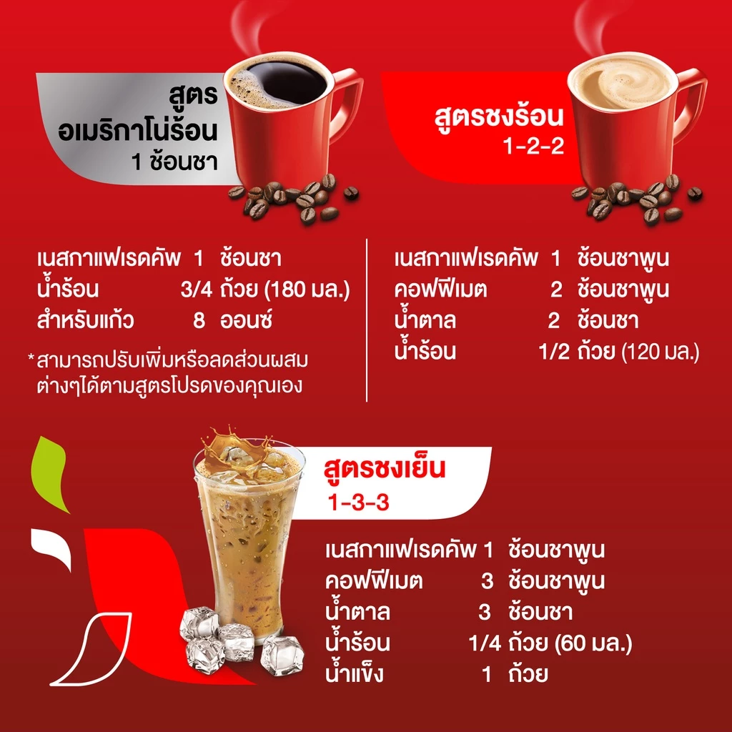 เนสกาแฟ เรดคัพ 1 ช้อนชาพูน ตามด้วยคอฟฟี่เมต 3 ช้อนชาพูนและน้ำตาล 3 ช้อนชา